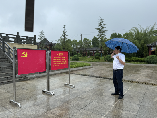 在鄂南烈士纪念碑前,冒着大雨,院长沈定文带领全体党员高举右手,重温入党誓词:“我志愿加入中国共产党,拥护党的纲领,遵守党的章程……”庄严神圣的誓词,使大家更加坚定了入党初心,表达了为党的事业奋斗终身的决心。