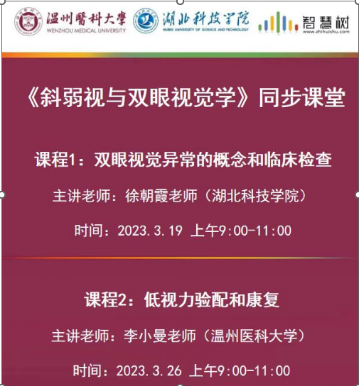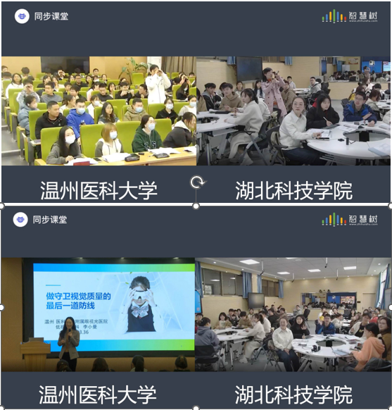 (通讯员:徐朝霞) 为深入推进教学改革创新,进一步加深校际合作交流,继3月19日Beat365官网与温州医科大学开展《斜弱视与双眼视觉学》同步课堂之后,3月26日两校再次开展第二次同步课堂教学,此次课程内容为低视力康复与验配,主讲老师温州医科大学李小曼老师与湖北科技学院徐朝霞老师一起,给同学们呈现了一堂内容丰富、互动频繁的精彩课堂。