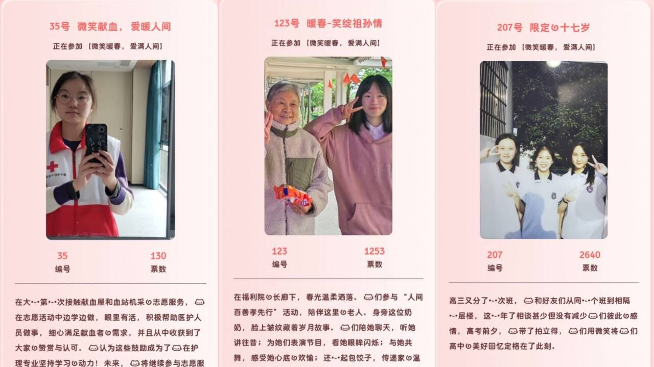 活动以“微笑为核心,设置线上故事分享与微笑展示环节,内容涵盖同学互助、师生互动、陌生人善意传递等真实场景。参与者通过图文、短视频等形式记录身边温暖瞬间,展现真诚微笑。活动期间,投稿作品累计超过200份,话题阅读量突破上千次,引发学生共鸣。通过线上投票,最终评选出20份“人气作品”,其中最高票数达3251票。不少学生表示,活动为情感宣泄提供了出口,帮助他们在忙碌学业中重新发现生活中的美好,更深刻理解了“微笑不仅是表情,更是积极的生活态度”。