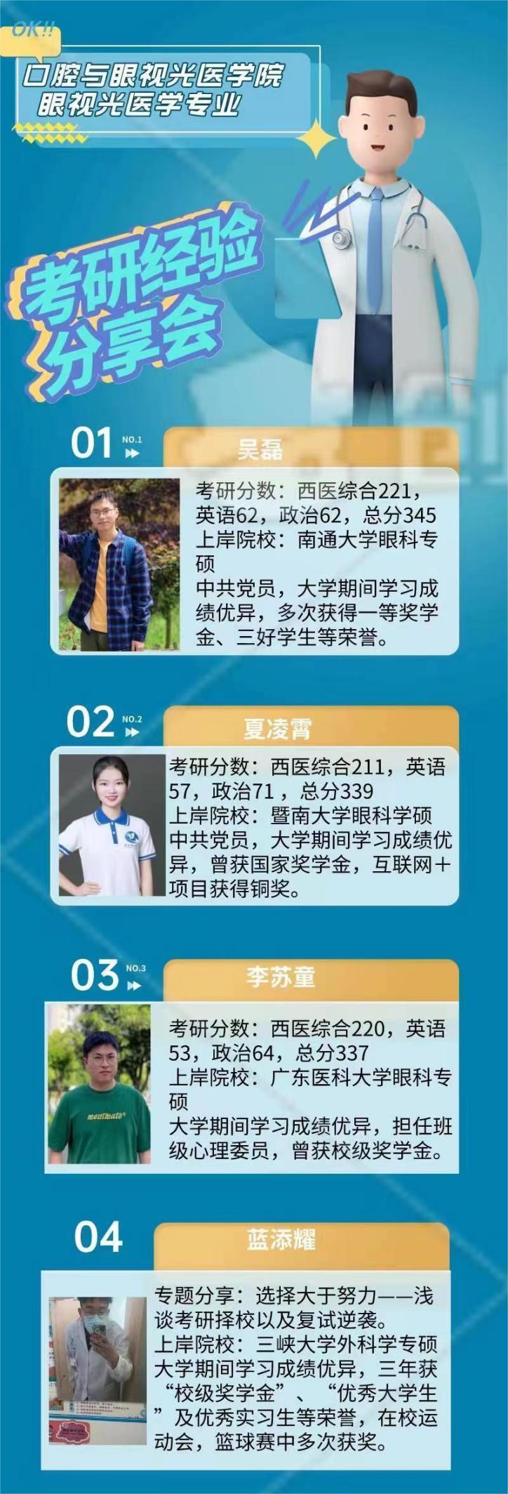 本次交流会邀请了18级眼视光医学专业考研成功的吴磊、夏凌霄、李苏童、蓝添耀四位同学围绕考研择校、备考经验、状态调整和复试计划等方面分享自己的心得。四位主讲人将自己的考研心得倾囊相授,详细地分享了学习经验,其中包括复习时间分配的策略以及相关复习方法、备考时身心健康的调整方法、报考院校及专业方向的选择等。向同学们推荐优质的学习资源,并把自己踩过的雷、跳进的坑和大家分享,有利于大家少走弯路,高效备考。