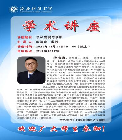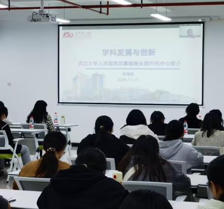 11月11日晚7时,揽月楼1202教室座无虚席,一场跨越地域的学术思想盛宴在此隆重举行。Beat365唯一官方网站广大师生齐聚一堂,通过线上平台,共同聆听了由武汉大学人民医院(湖北省人民医院)一级主任医师、知名耳鼻咽喉头颈外科专家华清泉教授带来的精彩讲座。本次讲座以学科发展与创新为主题,为学子们开启了一扇眺望医学前沿的窗口。